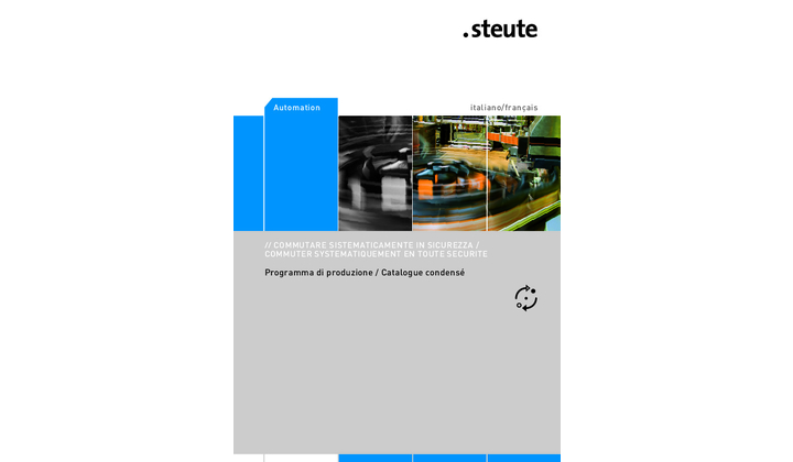 Grâce à ses interrupteurs, capteurs et organes de commande, Steute est mondialement présent dans quatre domaines d’activités (Wireless, Automation, Applications sévères ou Environnements extrêmes, dispositifs médicaux). Ce catalogue vous fait découvrir toute cette gamme.