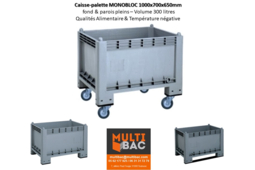 Caisse-palette 1000x700x650 mm d'un volume de 300 litres avec fond et parois pleins et qui autorise une charge maximum dans la caisse de 300 kg . Une caisse-palette qui dispose d'une finition avec 4 roues mobiles. Matière PP 100% matière vierge qualité alimentaire & température négative ou Qualité industrielle en matière recyclée