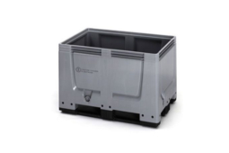 Caisse-palette 1200x800x850 mm avec un volume de 550 litres. Caisse palette avec fond et parois ajourés sur 4 pieds. Caisse palette en PP 100% matière vierge ou qualité industrielle. Couleur: Gris. Accessoires: Couvercle, 1 côté abattant, 4 roues pivotantes.
