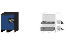 Cette armoire pour produits chimiques répond aux règles de sécurité sur le stockage sécurisé de produits polluants et toxiques mais aussi de liquides inflammables selon la norme H 224-226.L'armoire possède un système de raccordement (DN 75) ainsi qu'un système de ventilation.