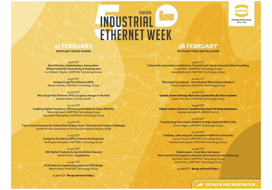 Les 25 et 26 Février 2026 HARTING Technology Group organise son 5ème évènement numérique avec des sessions quotidiennes en direct sur le thème de l’Ethernet Industriel.